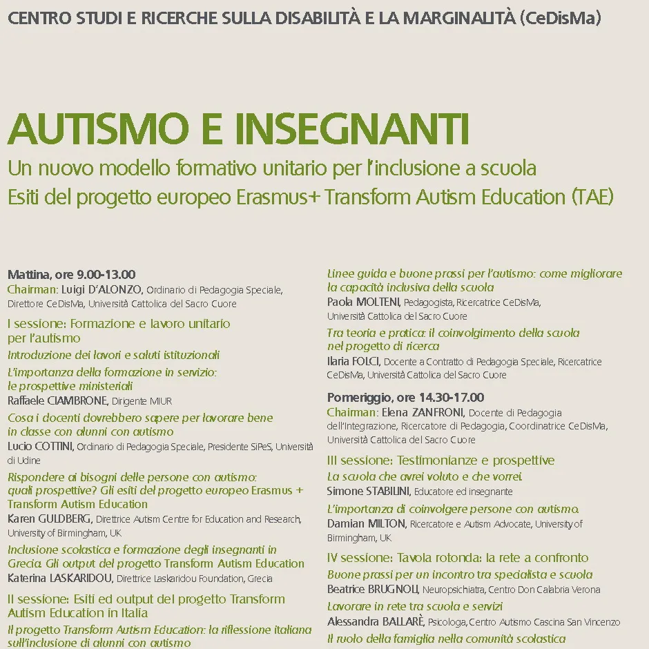 Convegno “Autismo e insegnanti. Un nuovo modello formativo unitario per l’inclusione a scuola Esiti del progetto europeo Erasmus+ Transform Autism Education (TAE)”. Milano 8 giugno 2016