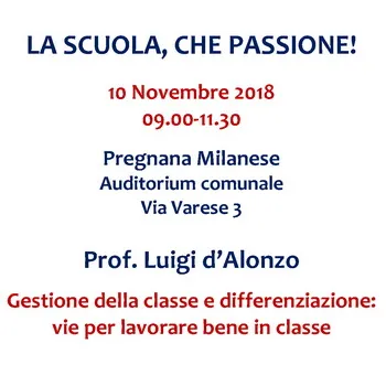 Il prof. Luigi d’Alonzo sabato 10.11.2018 dalle ore 09.00 alle ore 11.30 terrà una relazione dal titolo “Gestione della classe e differenziazione. Vie per lavorare bene in classe” in Pregnana Milanese presso l’Auditorium comunale di Via Varese 3.